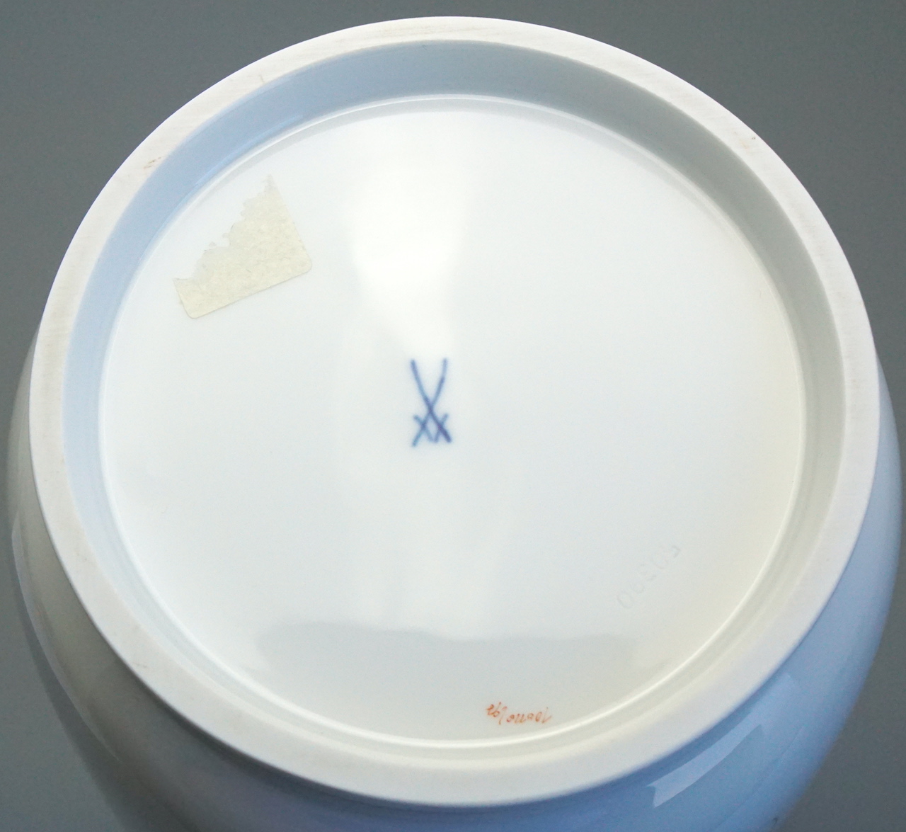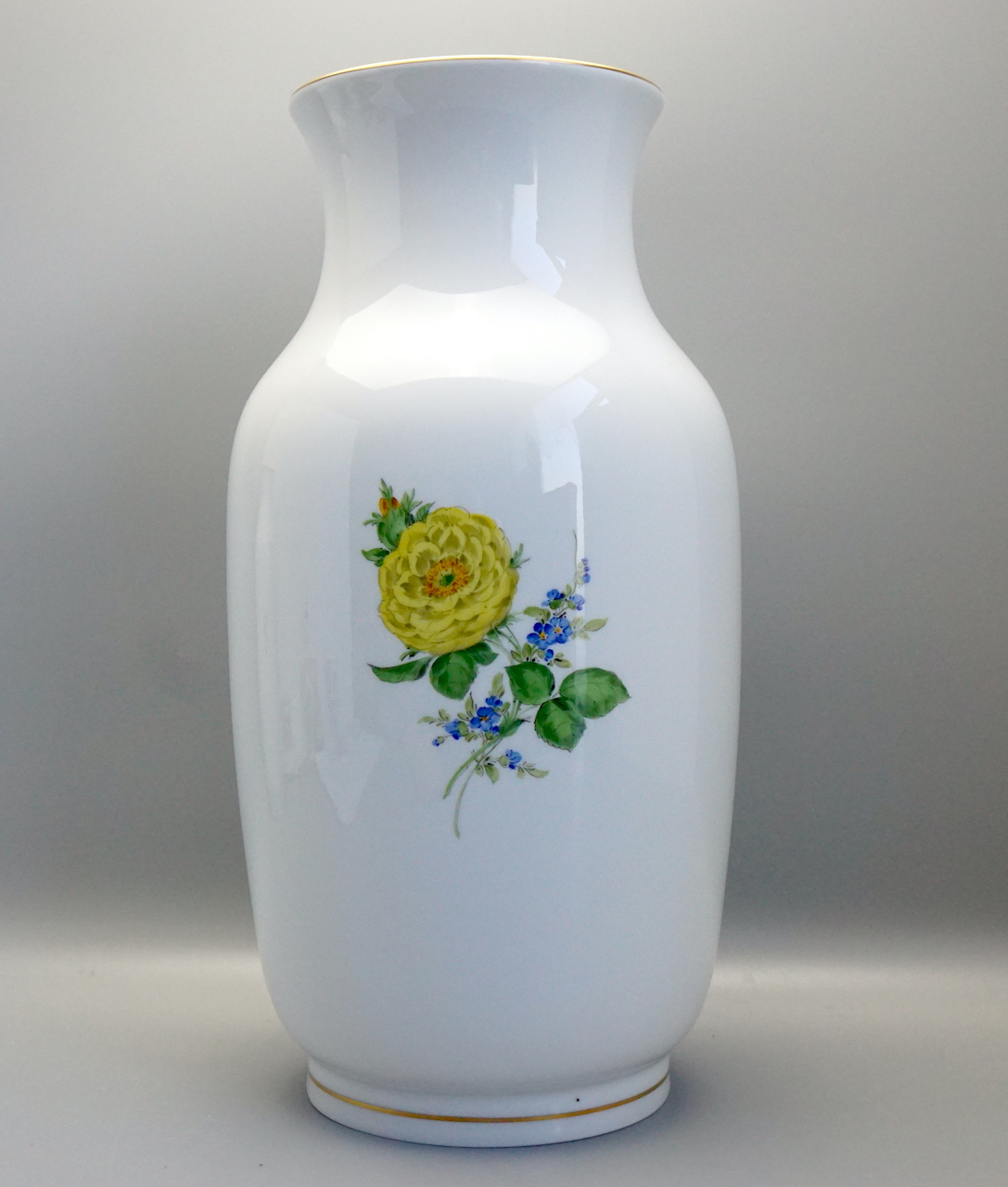 Höhe 37 cm, Durchmesser 13,7 cm. Unterglasur blaue Schwertermarke 1 Wahl.
