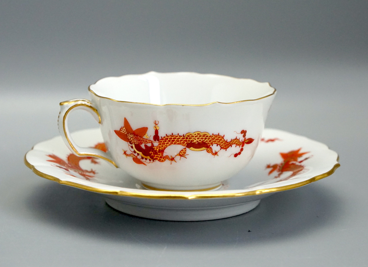 Moccatasse mit Untertasse aus Meissener Porzellan. Dekor: reicher Drache rot.