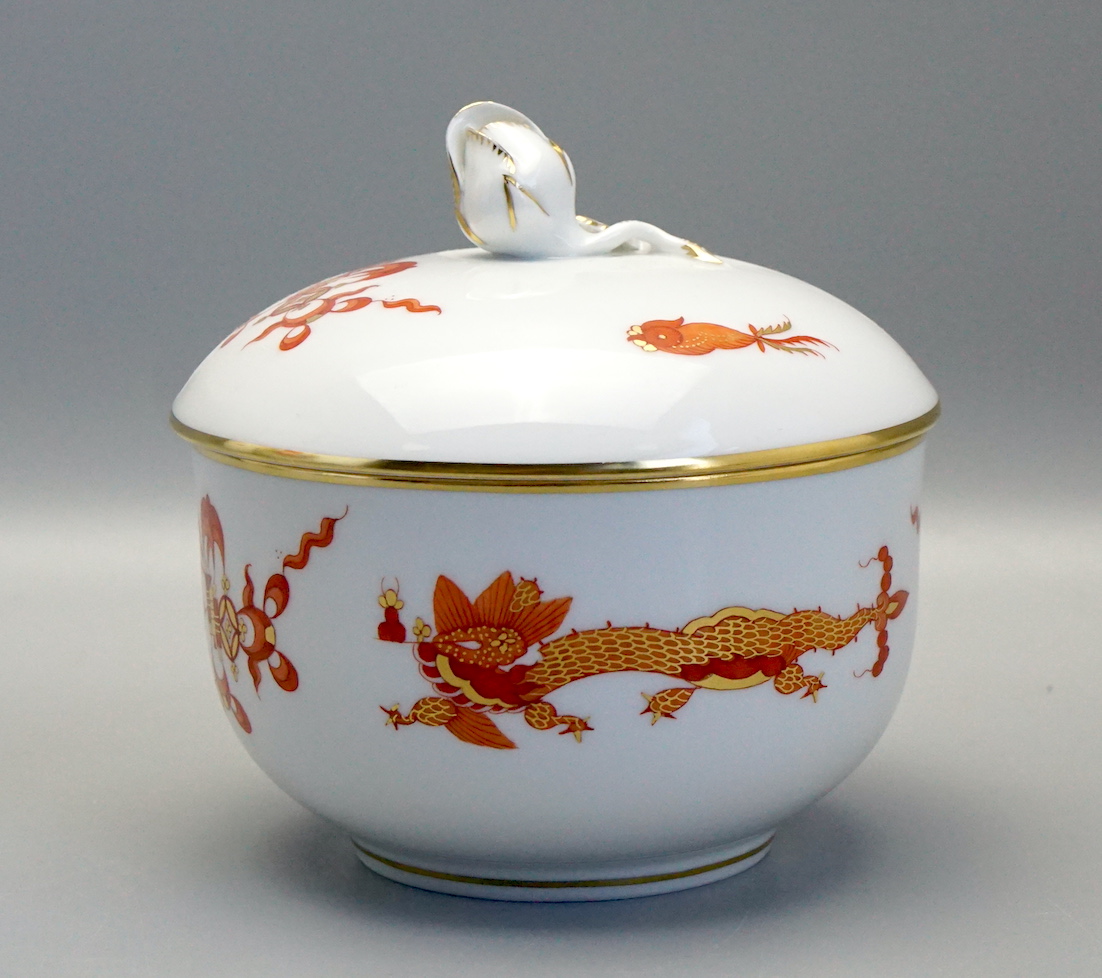 Zuckerdose aus Meissener Porzellan. Dekor: reicher Drache rot.