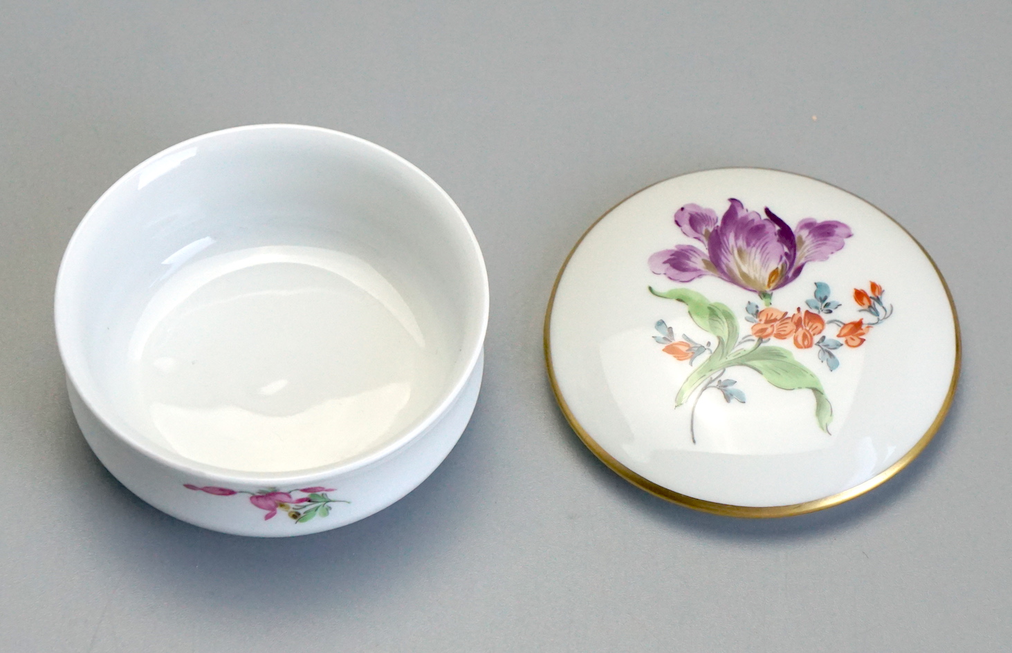 Deckeldose aus Meissener Porzellan. Dekor: Blume 2.