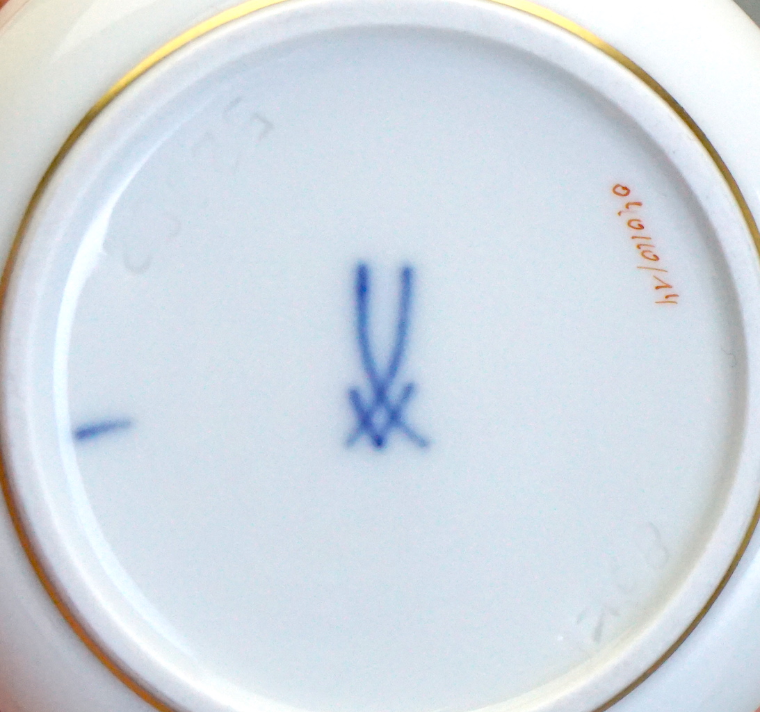 Durchmesser 7 cm, Höhe 3,5 cm. Unterglasur blaue schwertermarke 1 Wahl.