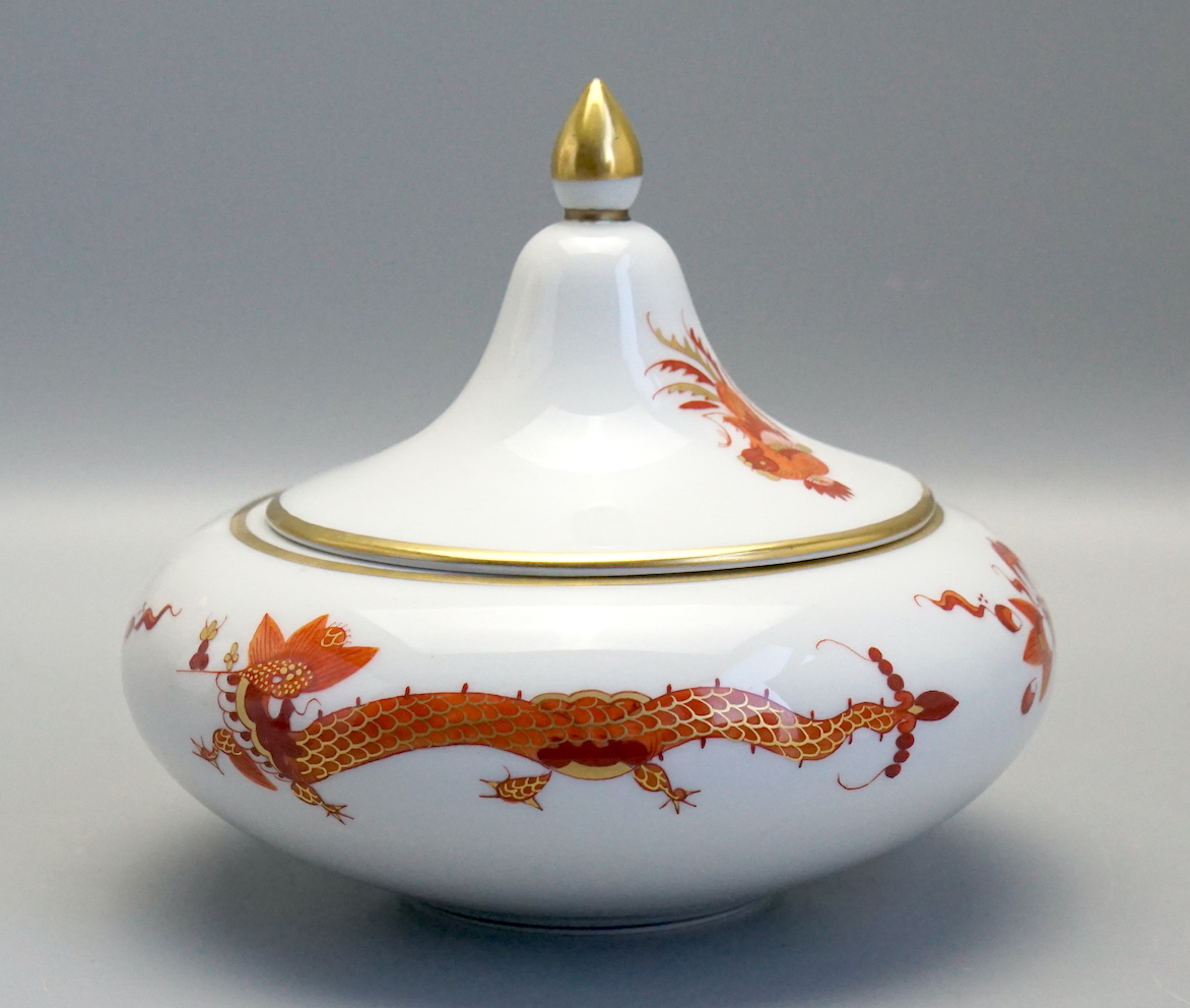 Deckeldose aus Meissener Porzellan. Dekor: roter Mingdrache.