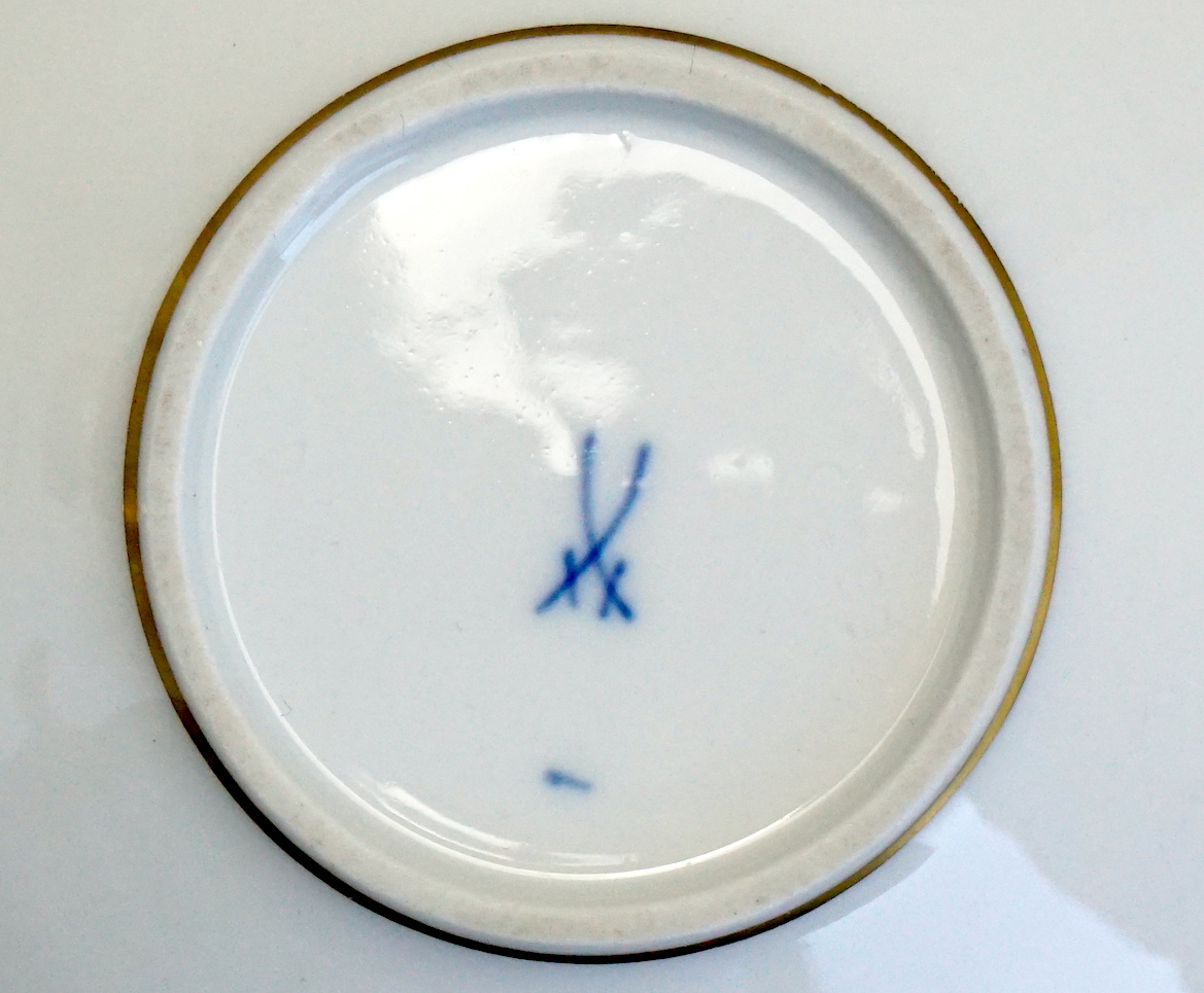 Höhe 10 cm. Durchmesser 7,8 cm. Unterglasur blaue Schwertermarke 1 Wahl.