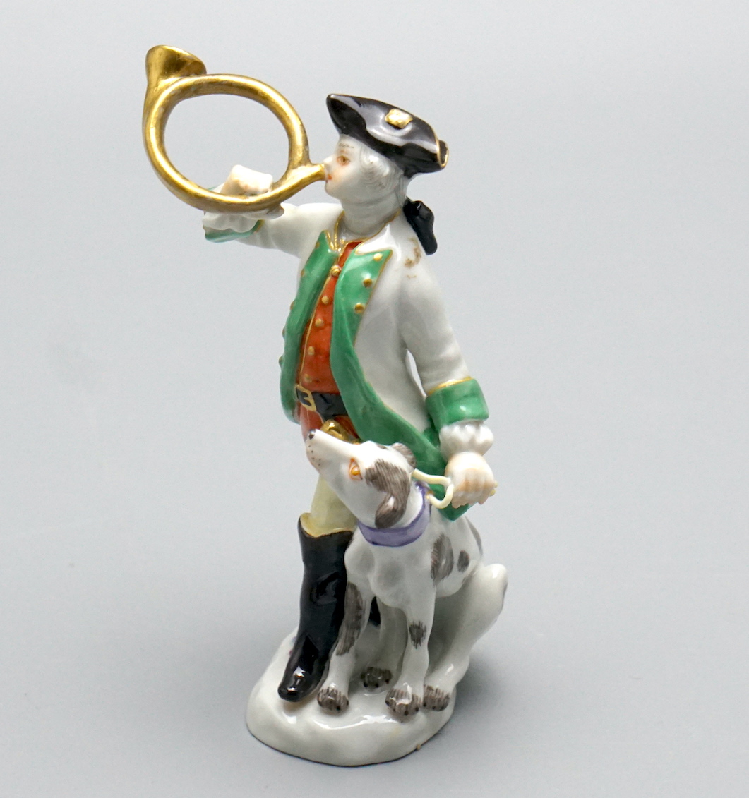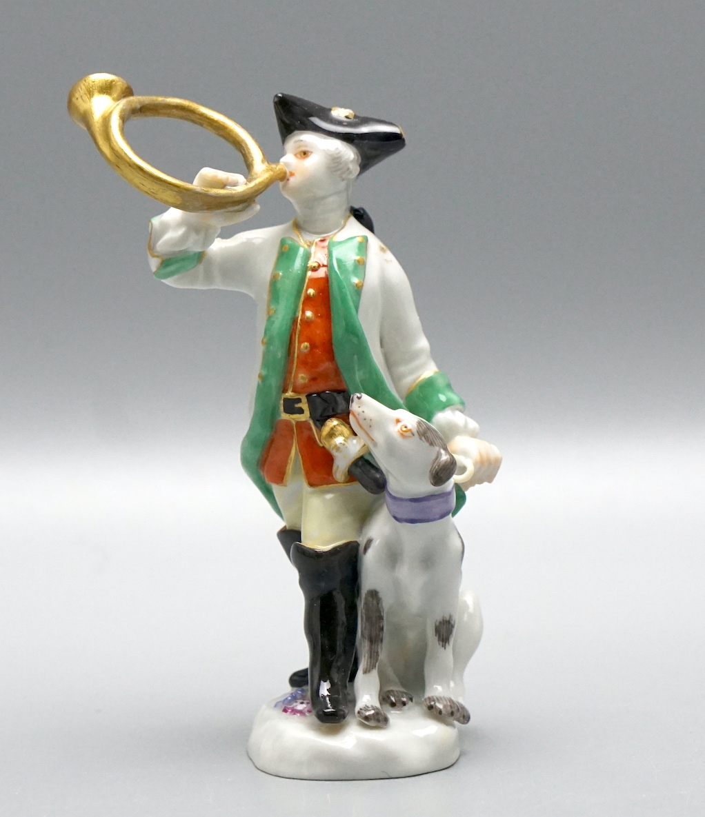 MEISSEN Miniatur Figur „Jäger mit Waldhorn & Jagdhund“ – 1. Wahl – H 8,8cm