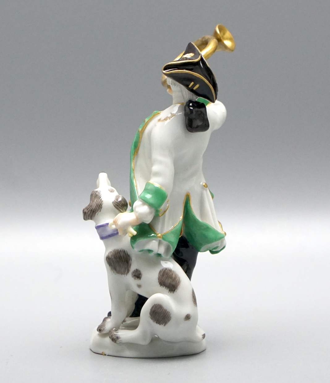 Mobile Preview: MEISSEN Miniatur Figur „Jäger mit Waldhorn & Jagdhund“ – 1. Wahl – H 8,8cm