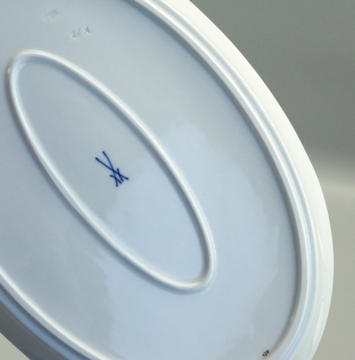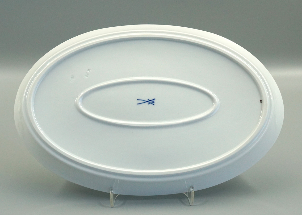 Länge 26,9 cm, Breite 17,7 cm, Höhe 2 cm. Unterglasur blaue schwertermarke 1 Wahl um 1989.