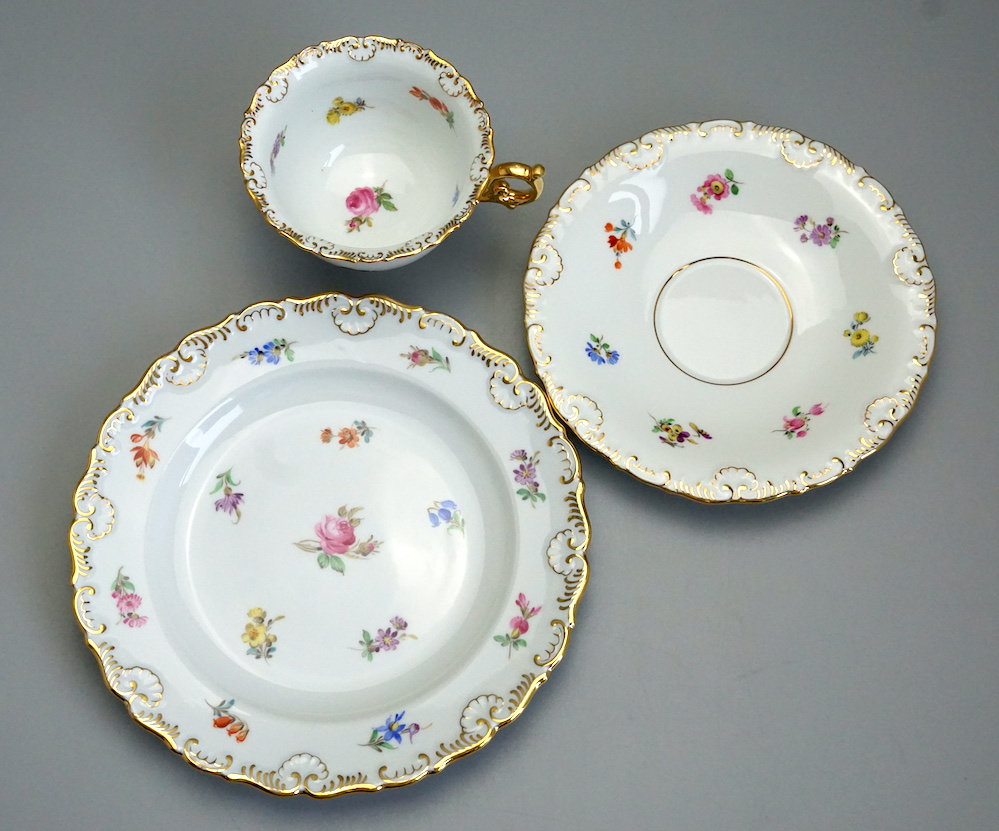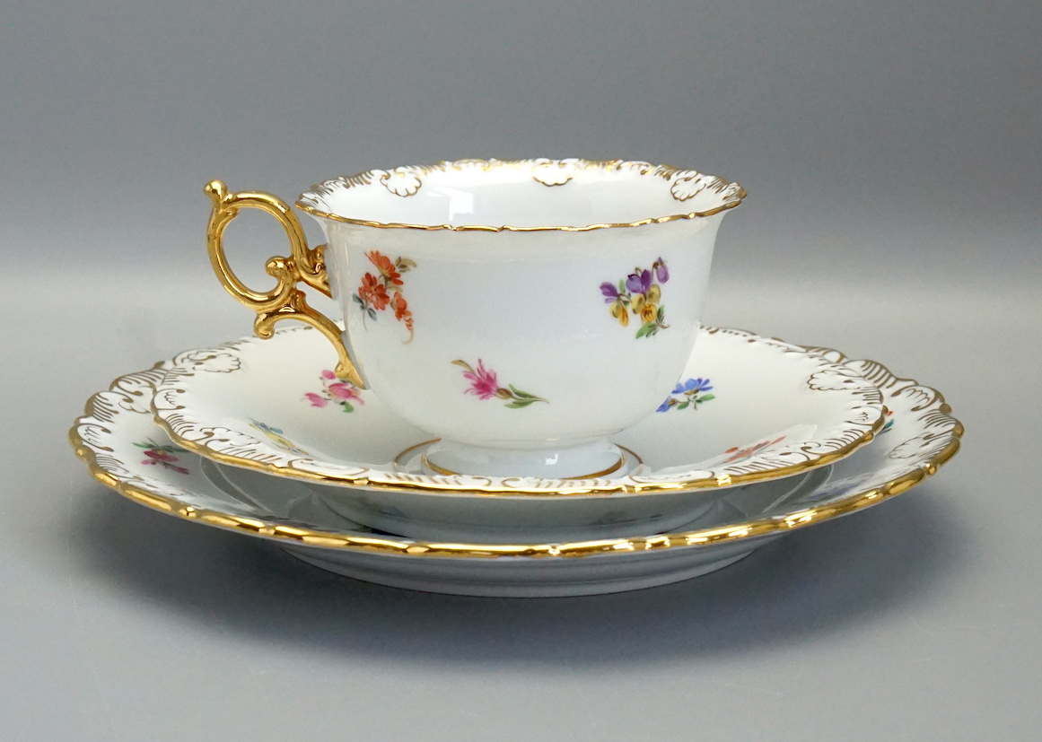 Meissen Prunk Tee/Kaffeegedeck Streublume Muschelrand. 1 Wahl.
